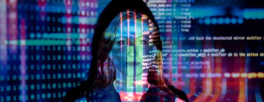 code projected over woman